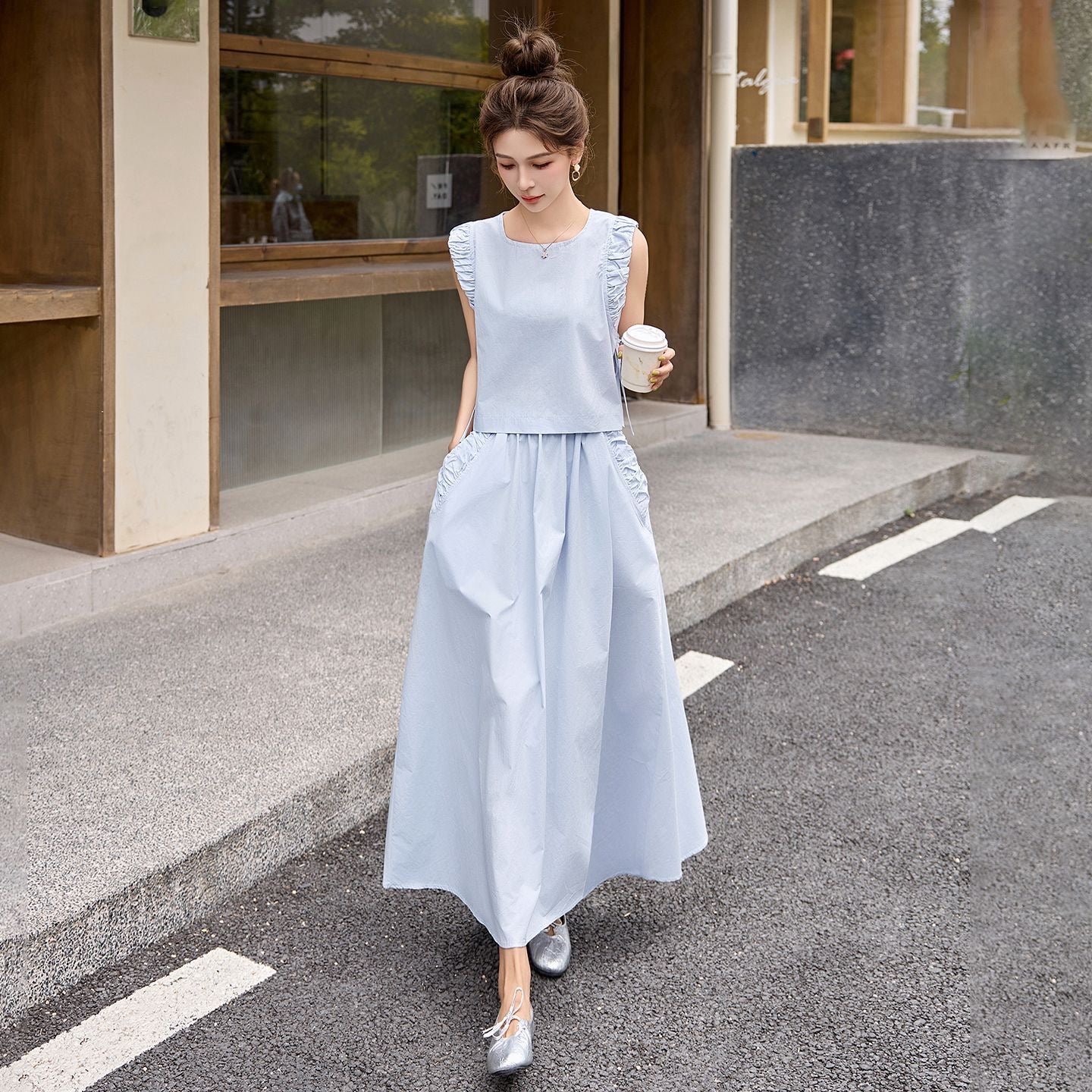 💙ブルーの上品なノースリーブトップスに、 シンプルなシルエットが、清楚でレディライクな雰囲気を演出🌸 👗 清楚で上品な貴女へ。 |