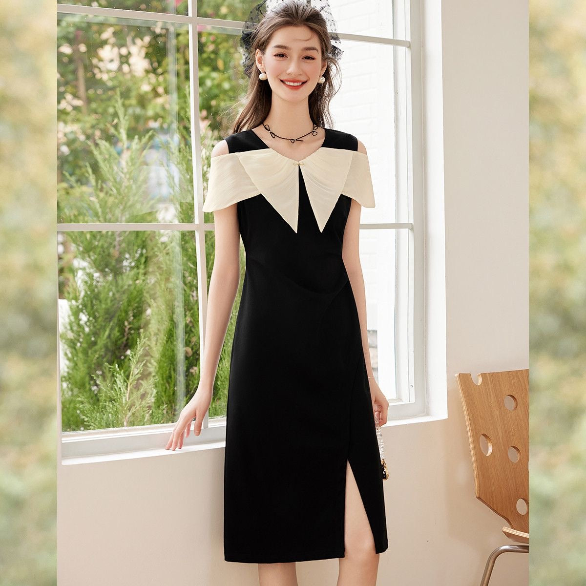 ✨ オフショルダーVネックで魅せる、大人のセクシー🎀 👗 立体感あるパネル拼接が気品をプラス! 🖤 脚元に軽やかさを添えるスリットデザイン👠 |
