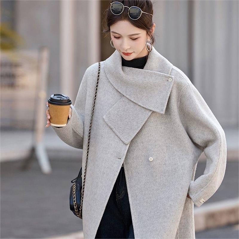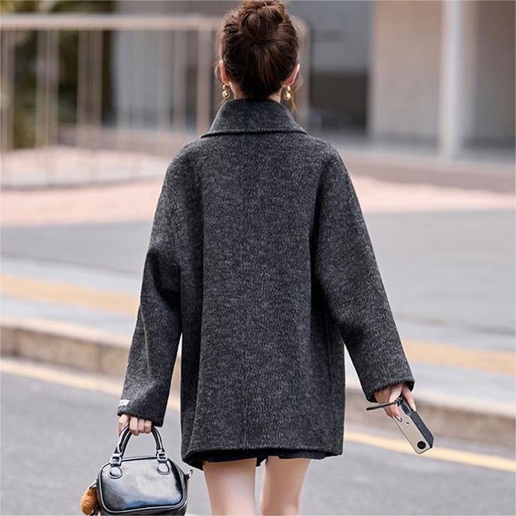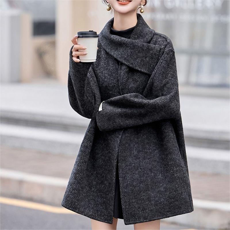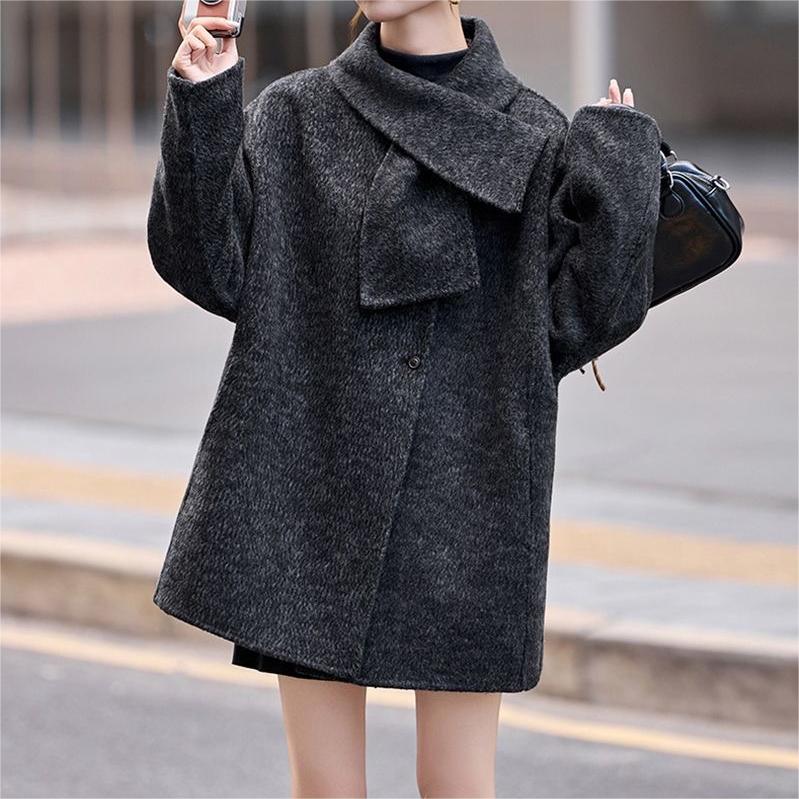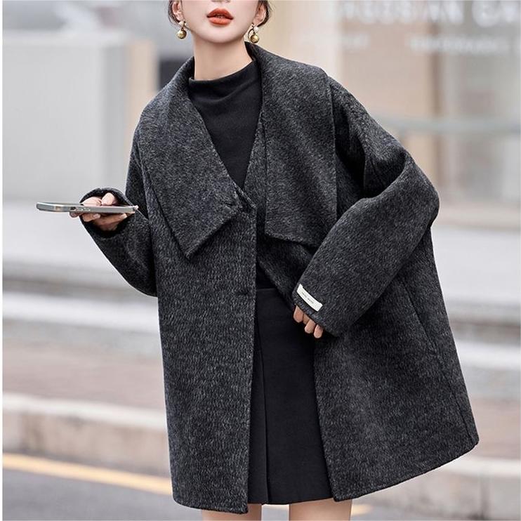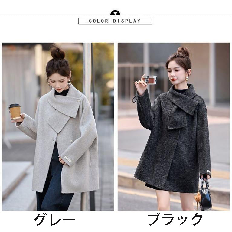 上質なウール素材と、ゆったりとしたシルエットが、上品で気高い雰囲気を醸し出します。✨ たち襟のデザインが首元をすっきりと見せ、どんなスタイルにも映える、大人の女性のための一枚です。💕 秋冬の装いに、しなやかな気品をプラス。💼 |