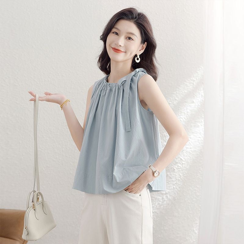 🌸エレガントでシンプルなデザインが魅力のノースリーブシャツ✨ 👗透け感のない高級素材で、夏のデイリー使いにも最適♡ |